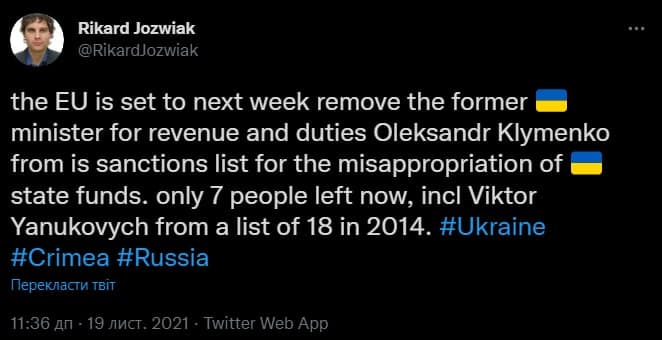"ЕС намерен на следующей неделе исключить бывшего министра доходов и сборов Украины Александра Клименко из санкционного списка за растрату государственных средств", - сообщил журналист.