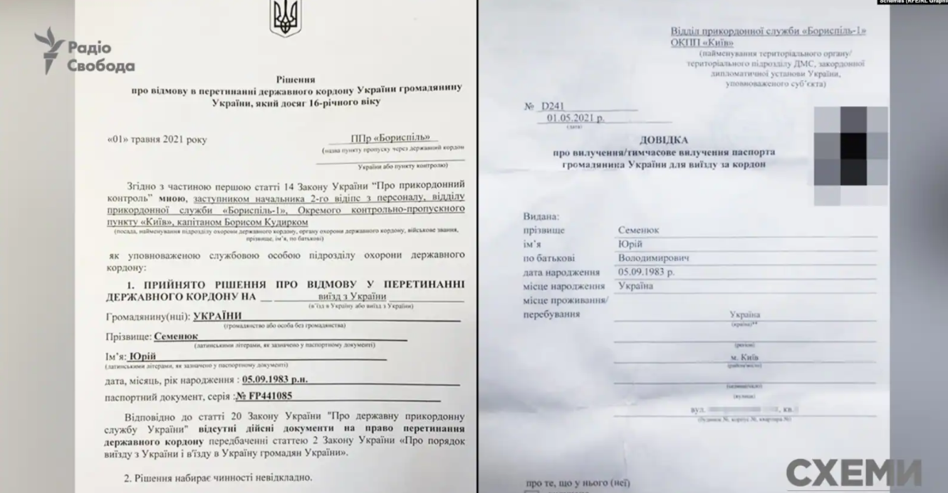 Первым об этом узнал Юрий Семенюк, который в мае 2021 года не смог из аэропорта "Борисполь" вылететь в Египет и у него изъяли загранпаспорт.