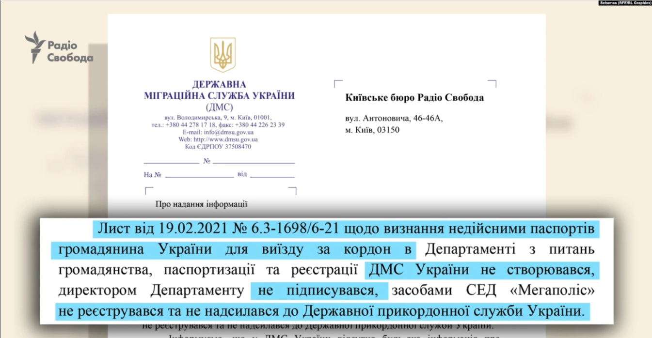 "Письмо от 19 февраля 2021 года по таким реквизитам о признании недействительными паспортов гражданина Украины для выезда за границу..., в Государственной миграционной службе не создавалось, … не подписывалось, не регистрировалось и не направлялось в Государственную пограничную службу", – говорится в ответы ДМС.