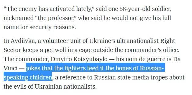 "В Авдеевке добровольческое подразделение ультранационалистического Правого сектора Украины держит домашнего волка в клетке возле офиса командира. Командир Дмитрий Коцюбайло - его боевой псевдоним Да Винчи - шутит, что бойцы кормят его костями русскоязычных детей", - пишет New York Times.