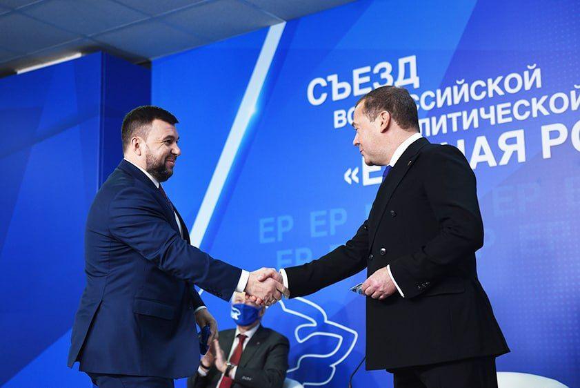 Председатель партии "Единая Россия" Дмитрий Медведев вручил партийные билеты главам четырех регионов РФ, руководству так называемых "Донецкой и Луганской народных республик", а также депутатам Государственной думы.