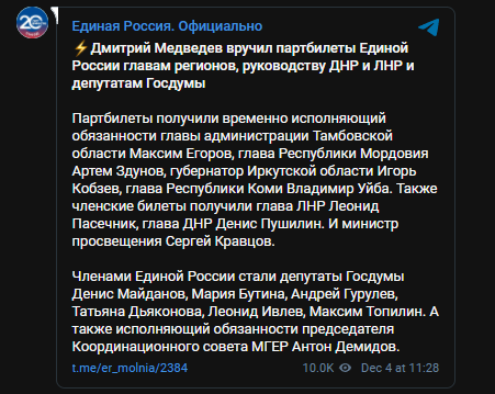 "Дмитрий Медведев вручил партбилеты "Единой России" главам регионов, руководству ДНР и ЛНР и депутатам Госдумы. Партбилеты получили временно исполняющий обязанности главы администрации Тамбовской области Максим Егоров, глава Республики Мордовия Артем Здунов, губернатор Иркутской области Игорь Кобзев, глава Республики Коми Владимир Уйба. Также членские билеты получили глава ЛНР Леонид Пасечник, глава ДНР Денис Пушилин. И министр просвещения Сергей Кравцов", - указано в сообщении.