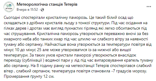 Кристаллическая изморозь образовалась в ночь на 6 декабря. Фото: facebook.com/msteteriv