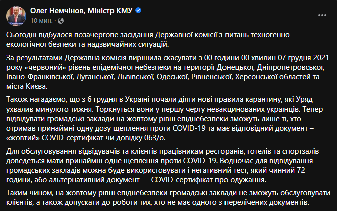 "Сегодня состоялось внеочередное заседание Государственной комиссии по техногенно-экологической безопасности и чрезвычайным ситуациям. По результатам Государственная комиссия решила отменить с 00 часов 00 минут 07 декабря 2021 "красный" уровень эпидемической опасности на территории Донецкой, Днепропетровской, Ивано-Франковской, Луганской, Львовской, Одесской, Ровенской, Херсонской областей и города Киева", - сообщает на своей странице в Facebook министр КМУ Олег Немчинов.
