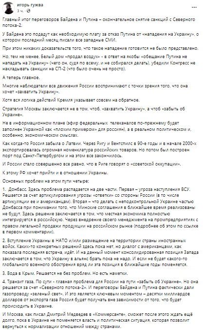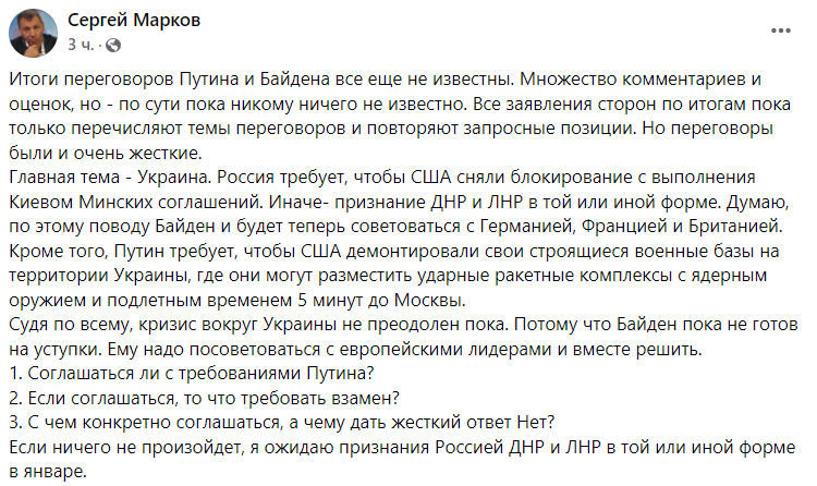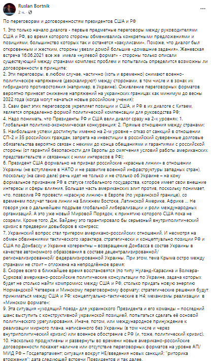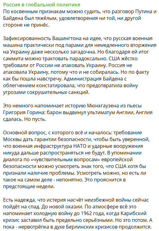 "Итоги переговоров Путина и Байдена все еще не известны. Множество комментариев и оценок, но - по сути пока никому ничего не известно. Все заявления сторон по итогам пока только перечисляют темы переговоров и повторяют запросные позиции. Но переговоры были и очень жесткие.