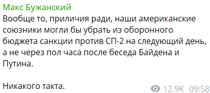 "Вообще-то, приличия ради, наши американские союзники могли бы убрать из оборонного бюджета санкции против СП-2 на следующий день, а не через полчаса после беседы Байдена и Путина.