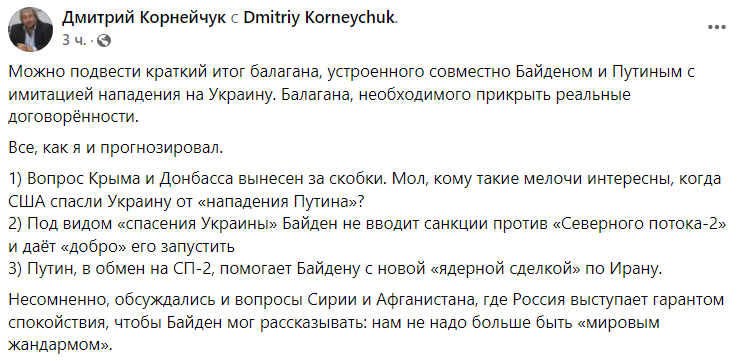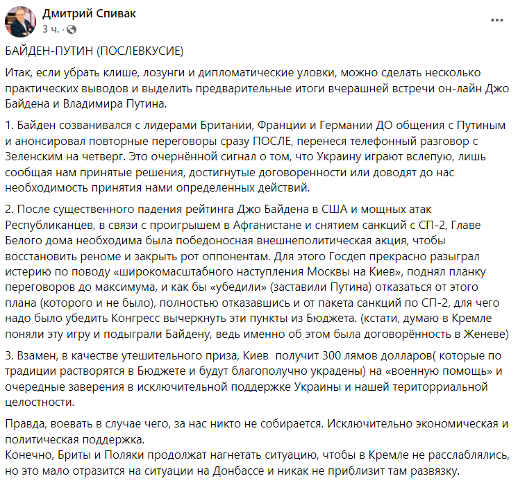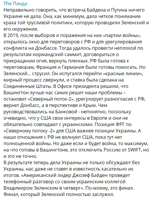 "Неправильно говорить, что встреча Байдена и Путина ничего Украине не дала. Она как минимум дала четкое понимание краха той трусливой политики, которую проводили Зеленский и его окружение.