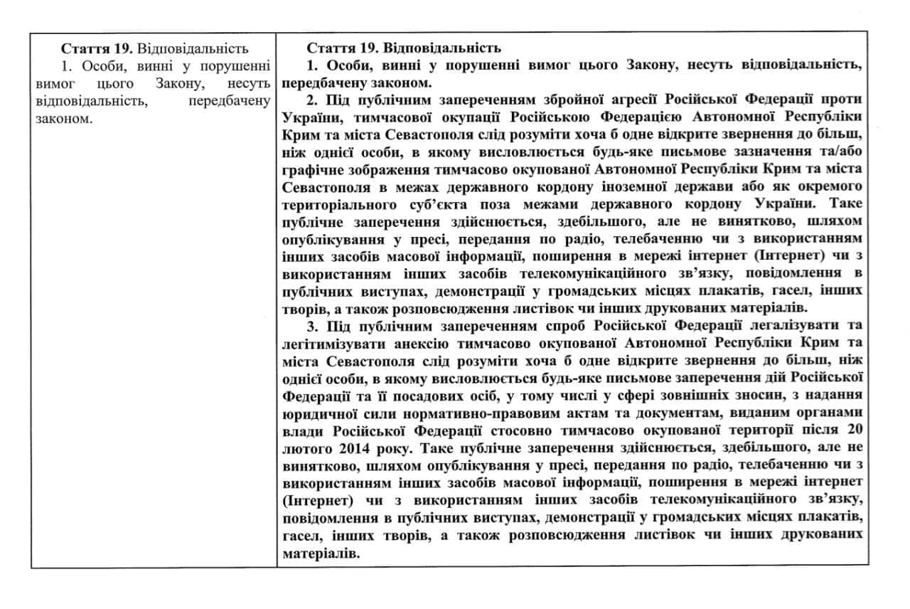 Под публичным возражением понимается "хотя бы одно открытое обращение к более чем одному лицу, в котором выражается любое письменное или графическое изображение Крыма или Донбасса российскими или как отдельного территориального субъекта, или отрицание попыток РФ легализовать и легитимизировать аннексию Крыма".