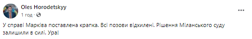 "В деле Маркива поставлена точка. Все иски отклонены. Решения Миланского суда оставили в силе. Ура!" - написал он.