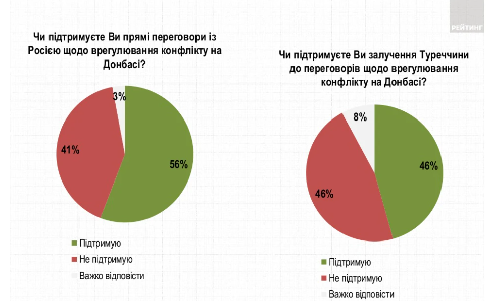 Согласно результатам опроса, 56% украинцев считают, что наша страна должна вести прямые переговоры с РФ для урегулирования конфликта на Донбассе, против - 41%. Еще 3% опрошенных затруднились с ответом.