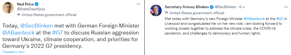"Сегодня госсекретарь Блинкен встретился с министром Анналеною Бербок на полях встречи G7, чтобы обсудить агрессию России против Украины, сотрудничество по вопросам климата и приоритеты президентства Германии в "большой семерке", - написал он.