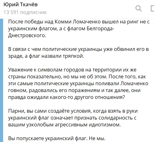 "Ломаченко вышел не с флагом Украины, а с флагом родного города. По этому поводу у патриотов очередное бурление. Как же ж так? Все стараются с патриотами заигрывать – это норма. А Ломаченко не заигрывает. Разве так можно?