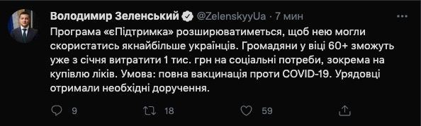 "Программа "еПоддержка" будет расширяться, чтобы ею могли воспользоваться больше украинцев. Граждане в возрасте 60+ смогут уже с января потратить 1 тыс. грн на социальные нужды, в частности, на покупку лекарств. Условие: полная вакцинация против COVID-19. Чиновники получили необходимые поручения", - сообщил Зеленский.