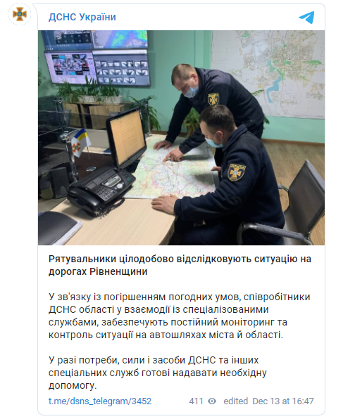 Указывается, что из-за снегопада спасатели круглосуточно отслеживают ситуацию на дорогах Ровенской области во взаимодействии с профильными службами. При этом в случае необходимости силы и средства ГСЧС и других специальных служб будут готовы оказать помощь.