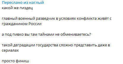 "Какой же @здец. главный военный разведчик в условиях конфликта живёт с гражданином России. А под пивко вы там тайнами не обмениваетесь?