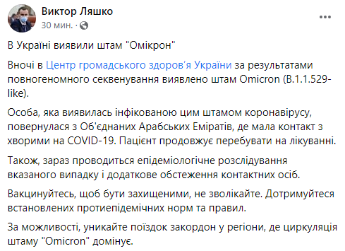 Министр здравоохранения Украины Виктор Ляшко заявил, что в Украине обнаружили штамм "Омикрон" у пациента, который ранее вернулся из ОАЭ