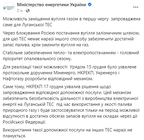 "Именно поэтому НКРЭКУ 17 декабря приняла решение о введении соответствующей вспомогательной услуги. Этот механизм обеспечит безубыточность деятельности по производству электрической энергии на Луганской ТЭС при использовании в качестве топлива природного газа и будет применяться только к периоду возможного отсутствия в достаточных объемах запасов угля на складах из-за действий Российской Федерации", - говорится в сообщении Минэнерго.