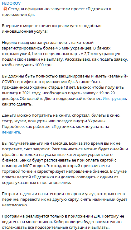 "Программа реализуется только в приложении "Дия". Поэтому не ведитесь на мошенников. Киберполиция будет внимательно отслеживать все подозрительные ситуации и выплаты", - добавил Федоров.