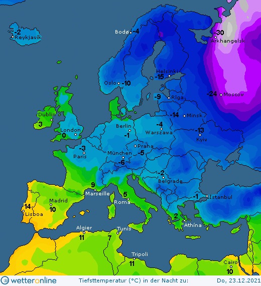 На западе и в центре до -4...-7 днем и -10...-14 ночью. В Полтавской, Днепропетровской областях -7...-9 днем и до -15 ночью. На юге 0...-5, ночью до -11.