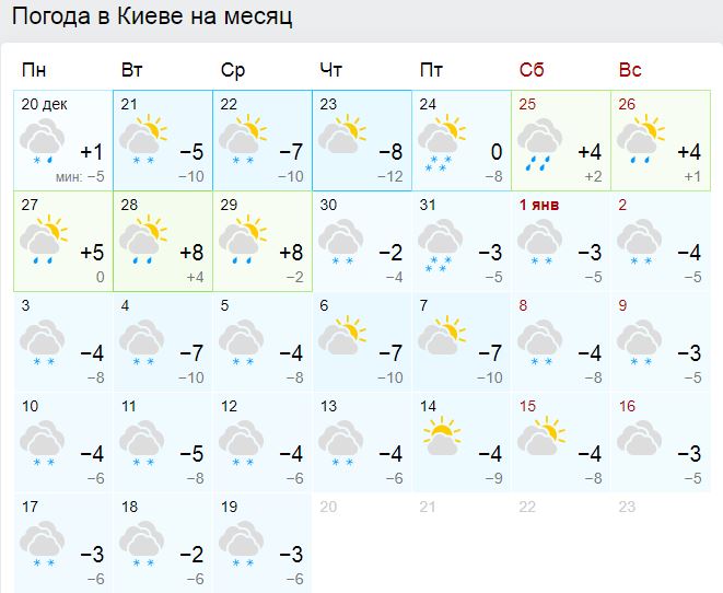 По данным погодного сайта, морозы до -5...-8 днем и -10...-12 ночью придут в Киев со вторника, 21 декабря. Они продержатся три дня с 21 до 23 декабря.
