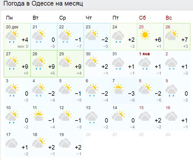 В Одессе сильных морозов в январе не будет. Максимум до -1...-2 днем и -5...-7 ночью 22 и 23 декабря. Затем потепление до +9, временами дожди.