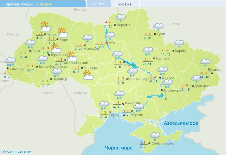 Прогноз погоды на 24 декабря. Данные Укргидрометцентра
