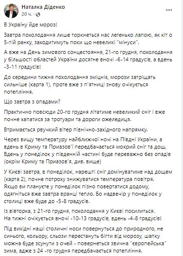 По данным синоптика Натальи Диденко, на День зимнего солнцестояния, 21 декабря, похолодание в большинстве областей Украины достигнет ночью -6...-14, а днем ​​-3....-11.