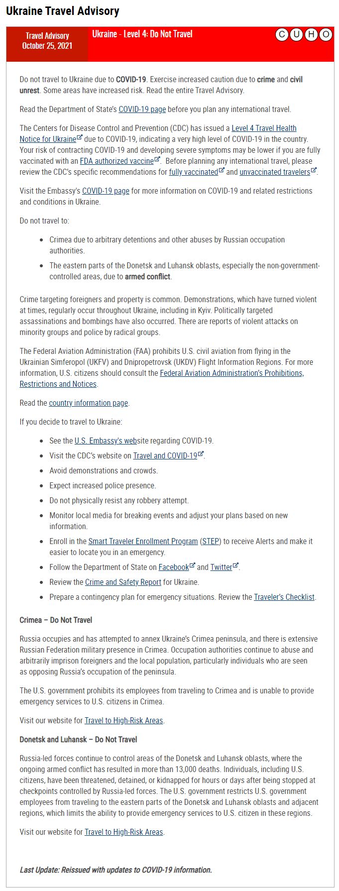 "Не путешествуйте в Украину из-за COVID-19. Соблюдайте повышенную осторожность из-за преступности и гражданских беспорядков. Некоторые области имеют повышенный риск. Прочтите всю информацию о путешествиях", - говорится в сообщении, опубликованном 25 октября 2021 года и дополненном 20 декабря 2021 года.