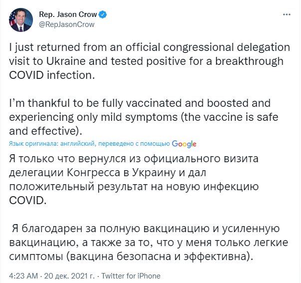 "Конгрессмен США Джейсон Кроу возглавил делегацию Конгресса в Киев, чтобы обсудить агрессивное наращивание российской военной мощи в Украине и вокруг нее, услышать оценки украинских официальных лиц и украинских официальных лиц. Конгрессмен Кроу вместе со своими коллегами Брэдом Венструпом и Риком Кроуфордом подчеркнул двухпартийную поддержку суверенитета и территориальной целостности Украины и ее евроатлантической траектории", говорилось в сообщении.