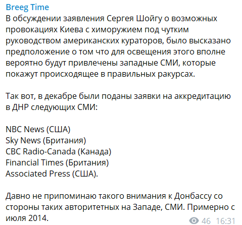 "Депутат Народного совета ДНР" Владислав Бердичевский у себя в телеграм-канале намекает, что готовится и информационное освещение вероятной химатаки. Он пишет, что в декабре крупные британские и американские медиа подали заявления об аккредитации в "республике". "Давно не припоминаю такого внимания к Донбассу со стороны таких авторитетных на Западе СМИ", - пишет Бердичевский.