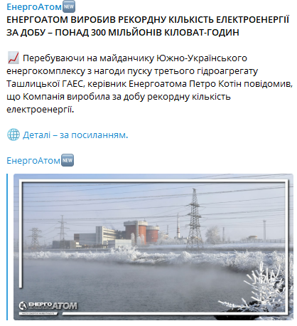 "Находясь на площадке Южно-Украинского энергокомплекса по случаю пуска третьего гидроагрегата Ташлыкской ГАЭС, руководитель Энергоатома Петр Котин сообщил, что Компания произвела в сутки рекордное количество электроэнергии", - говорится в сообщении.