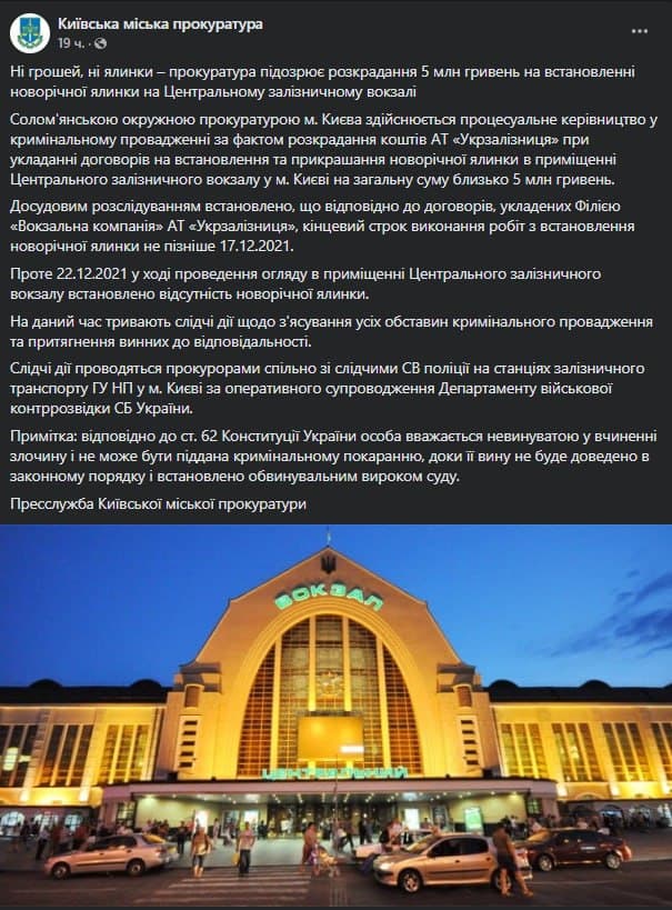 Досудебное следствие установило, что филиал "Вокзальная компания" акционерного общества "Укрзализныця" заключил договор на установку елки до 17 декабря включительно, хотя 22 декабря елка на вокзале так и не была установлена.