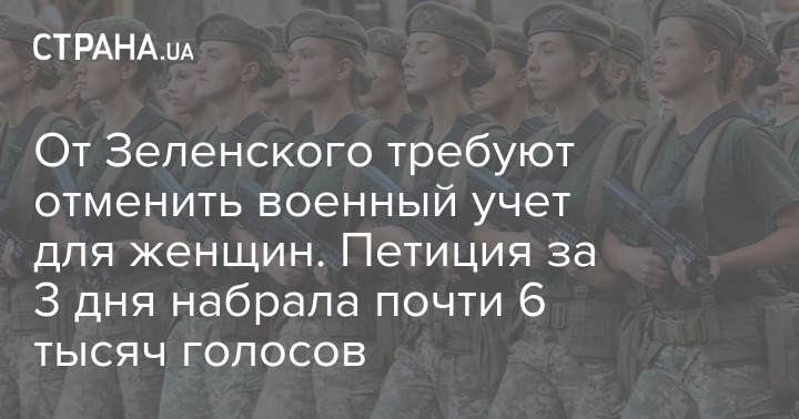 На сайте президента Украины появилась петиция с требованием к Владимиру Зеленскому отменить приказ Минобороны о постановке женщин на военный учёт. За три дня она набрала почти 6 тысяч голосов.