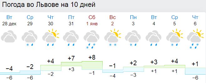 Новый год и выходные во Львове будет теплым и дождливым. 31 декабря до +7 днем и +3 ночью. Дождь.