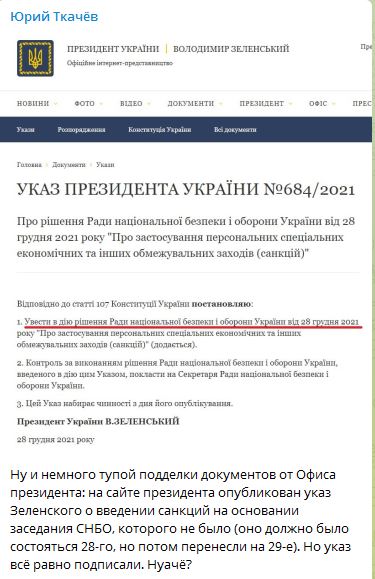 "Ну и немного тупой подделки документов от Офиса президента: на сайте президента опубликован указ Зеленского о введении санкций на основании заседания СНБО, которого не было (оно должно было состояться 28-го, но потом перенесли на 29-е). Но указ всё равно подписали. Ну а чё?" - написал Юрий Ткачев.
