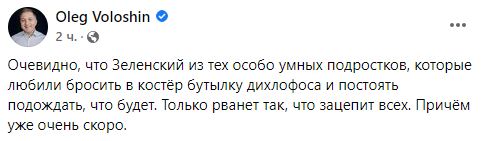 "Очевидно, что Зеленский из тех особо умных подростков, которые любили бросить в костёр бутылку дихлофоса и постоять подождать, что будет. Только рванет так, что зацепит всех. Причём уже очень скоро" - написал депутат от ОПЗЖ Олег Волошин.