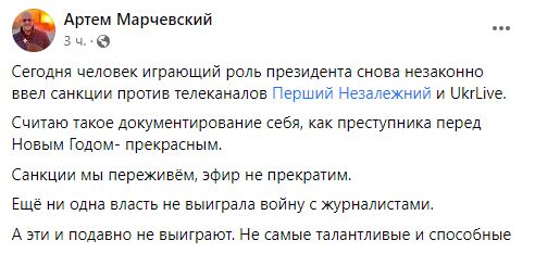 Санкции мы переживём, эфир не прекратим. Ещё ни одна власть не выиграла войну с журналистами. А эти и подавно не выиграют. Не самые талантливые и способные" - написал совладелец телеканала "Перший Незалежний" Артем Марчевский.