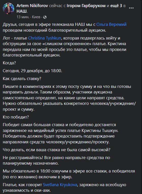 "Друзья, сегодня в эфире телеканала НАШ мы с Ольга Веремий проведем новогодний благотворительный аукцион. Лот - платье Кристины Тышкун, которая подверглась хейту и обструкции за свое "слишком откровенное" платье. Кристина передала нам по моей просьбе это платье, чтобы мы провели благотворительный аукцион", - объяснил ведущий.