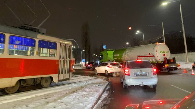 В среду вечером, 29 декабря, в  Киеве на пересечении улицы Вацлава Гавела и проспекта Любомира Гузара дорожно-транспортная авария заблокировала полосу для разворота машин.