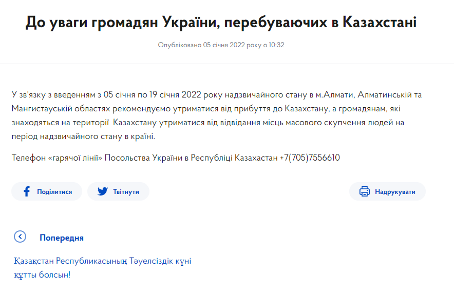 Посольство Украины в Казахстане опубликовало запись с рекомендацией для украинцев воздержаться от поездок на территорию республики, где сейчас проходят массовые протесты. Тем, кто уже находится на территории страны, советовали воздержаться от посещения мест массового скопления людей. Однако спустя два часа публикацию с рекомендацией удалили со всех Интернет-платформ посольства.