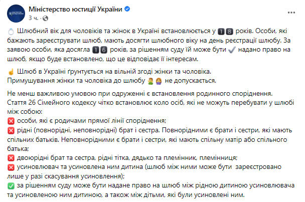 В Украине граждане, которые желают вступить в брак, могут это сделать с 18-летнего возраста, а с 16 лет это возможно только по решению суда. Об этом сообщает Минюст.