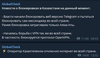 По данным GlobalCheck, власти начали блокировать веб-версию Telegram и пытаться блокировать сам мессенджер по всей стране. Ранее блокировка затрагивала только Алматы, где из-за "газовой революции" власти начали блокировать интернет и популярные мессенджеры.