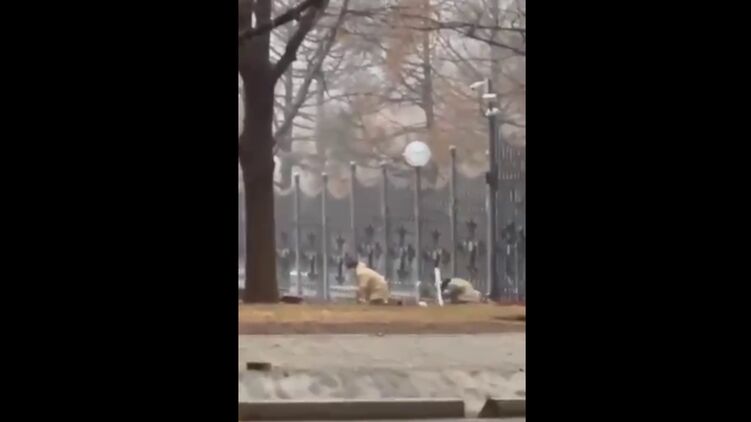 На кадрах, предположительно, военный или национальный гвардеец. Слышен выстрел, после чего человек в кадре резко падает на землю. Упавший одет в камуфляж, а в руке держит щит. Рядом горят пожары.