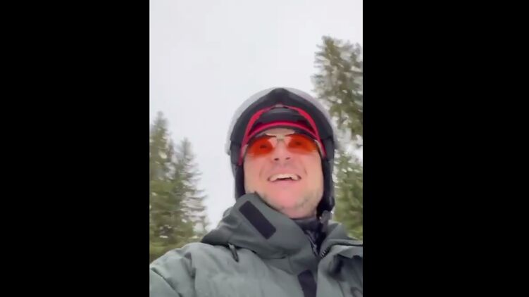 На кадрах видно, как Зеленский съезжает с горы, вероятнее всего, на сноуборде. Вокруг него катаются сноубордисты. На президенте шлем и очки для катания.