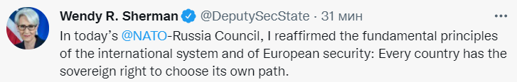 "На Совете НАТО-Россия сегодня (в среду, 12 января - Ред.) я подчеркнула фундаментальные принципы международной системы и европейской безопасности: каждая страна имеет суверенное право выбирать собственный путь", - написала Шерман в своем Twitter.