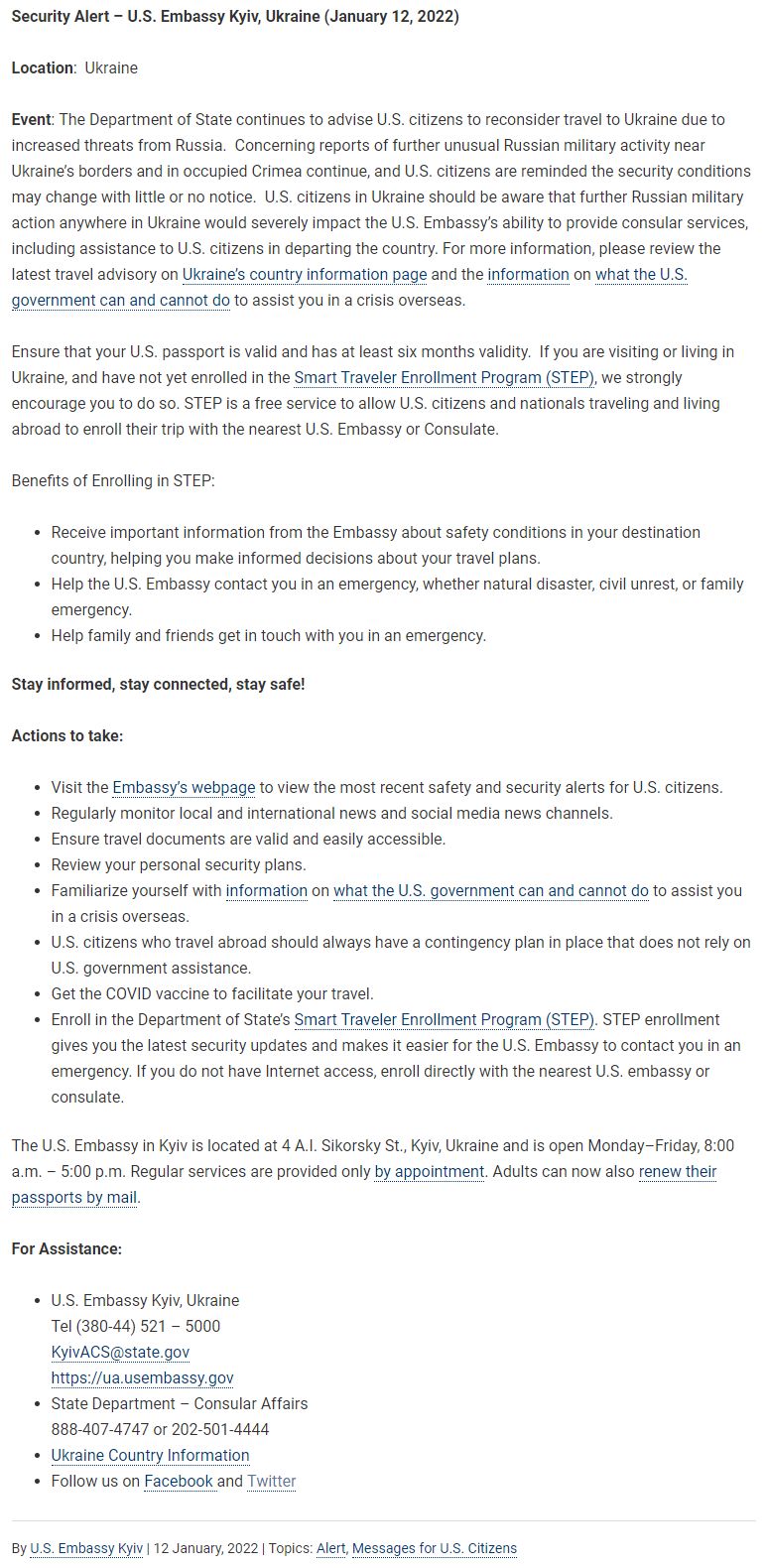 "Граждане США в Украине должны знать, что дальнейшие военные действия России в любой точке Украины серьезно повлияют на США. Способность Посольства предоставлять консульские услуги, включая помощь гражданам США при выезде из страны. Для получения дополнительной информации, пожалуйста, ознакомьтесь с последними рекомендациями по путешествиям на странице информации о стране в Украине и информацией о том, что США правительство может и не может сделать, чтобы помочь в кризисе за границей", сообщает Госдеп.