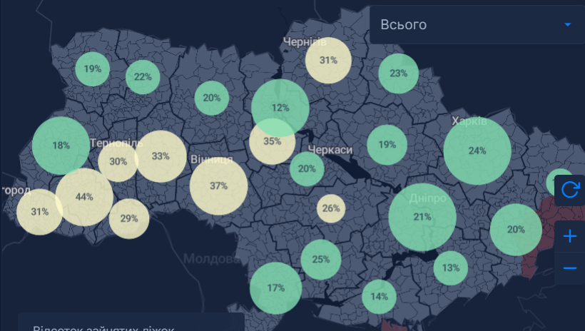 Из общей картины выбивается только Ивано-Франковская область, где в больницах занято 44% мест. В остальной Украине этот показатель колеблется в пределах 15-35%.