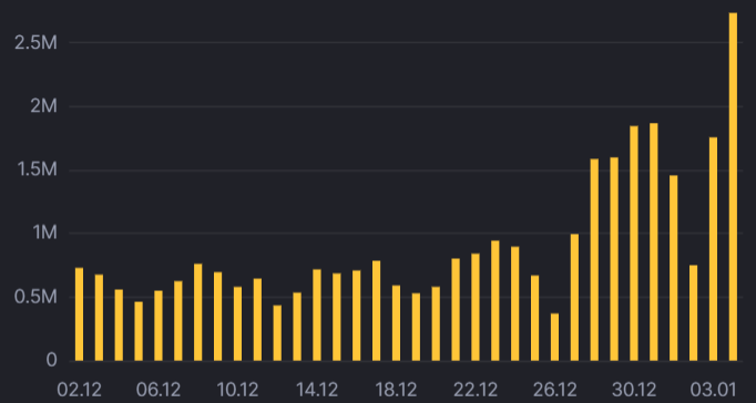 Вот для сравнения два графика, охватывающие период с начала декабря по середину января. По первому из них виден всплеск заболеваемости по всему миру - выше двух миллионов случаев за сутки.