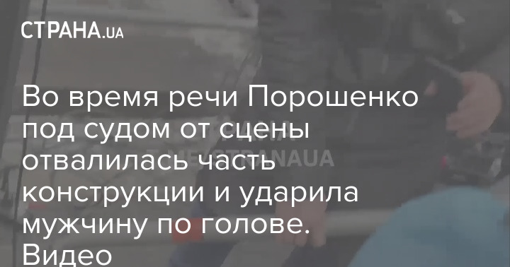 В понедельник, 17 января, во время выступления экс-президента Петра Порошенко под Печерским судом, который сейчас избирает ему меру пресечения, от сцены отвалилась часть металлической конструкции и ударила по голове человека.