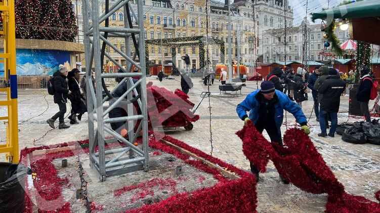 На Софийской площади в Киеве начался демонтаж новогоднего городка. Фото, видео
